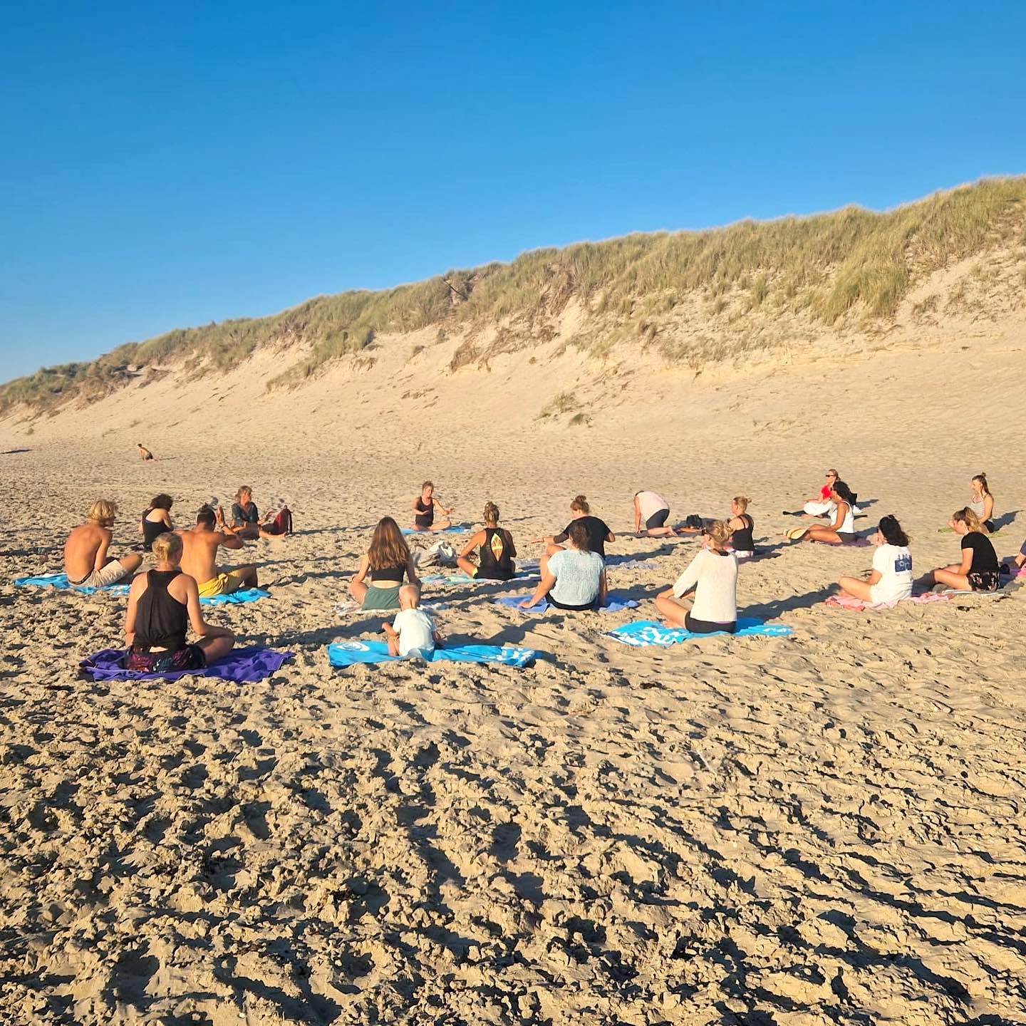 Der Yoga-Kurs findet auf Höhe der Surfschule am Strand mit dem Meer im Hintergrund statt. Wir verwenden keine Matte, daher ist es ratsam, selbst ein großes Handtuch mitzubringen.